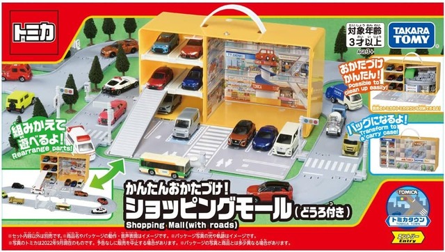 トミカタウンのどうろがたくさんセットになったショッピングモールが登場! トミカタウンやトミカがしまえるおかたづけバッグにもなるよ。 トミカをたくさん駐車できる大きなショッピングモールです。 ショッピングモールにはトミカやトミカタウンを収納できます。 フタを閉じればバッグになるので持ち運びにも便利です。 同梱のトミカタウンどうろは自由にレイアウトを組みかえられます。 別売りのトミカタウンと組み合わせてまちづくり遊びが楽しめます。